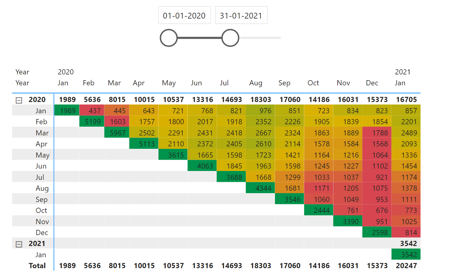 I’ve replicated your dax indicator in my new xls file (expecting to be the final) that my IT provided, but according to pbi results attached, I have some question:– I have noticed that some row and column from matrix are no matching the color scale criteria expected. Ex: Row(Jan) X Column (1 and 2) – They are as green scale but the correct would be as red. But you can see more incorrect colors in the pbi. I guess that year filter should be consider in the indicator DAX. Can you confirm if so and what would be the correct place to include this filter in the dax?