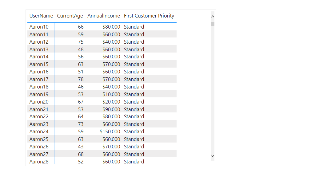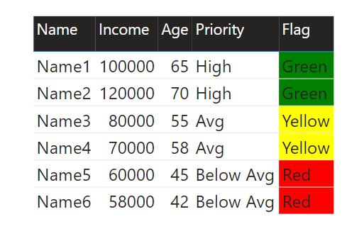 1. if currentAge < 60 and annualincome > 100,000 – priority should be green 2.if currentAge between 60 and 70 and annualincome between 60,000 and 100,000 – priority should be orange 3.if currentAge between > 70 and annualincome < 60,000 – priority should be red