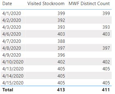 when ever my slicer selection fall under “Monday, Tuesday, and Friday i want to count(distinct count) all the stockroom in my daily data,