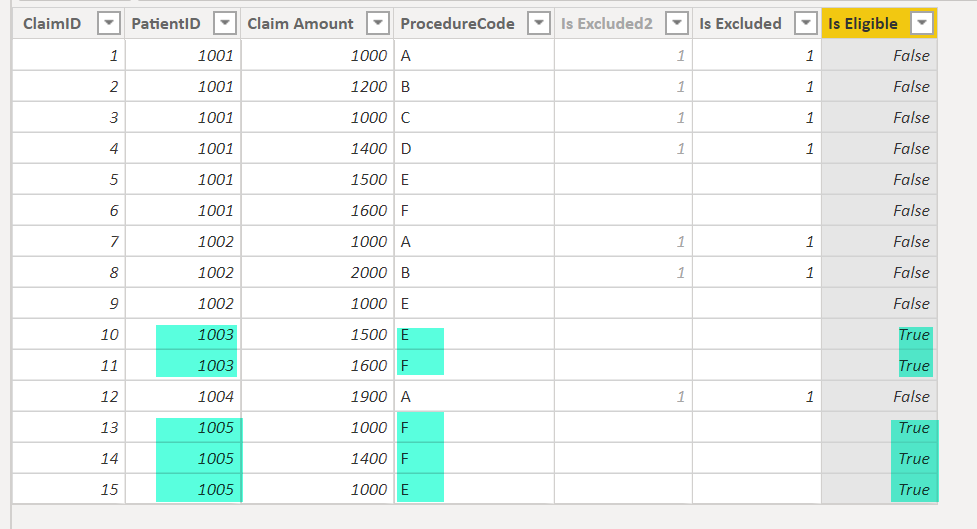 Is Eligible = --total the "is excluded" values for each patient, ignoring the row context filters from other columns VAR _totalIsExcuded = CALCULATE ( SUM ( 'Claims Table'[Is Excluded] ), ALLEXCEPT ( 'Claims Table', 'Claims Table'[PatientID] ) ) RETURN --the total isexcluded value will be blank only for those patients who never had an excluded procedure IF ( ISBLANK ( _totalIsExcuded ), TRUE (), FALSE () )?Is Excluded = --based on seperate table for ineligible procedures IF ( 'Claims Table'[ProcedureCode] IN VALUES ( 'Excluded Procedures Table'[ProcedureCode] ), 1, BLANK () )?Column [IsExcluded] is added twice just to show the different approach to store the Undesired procedure code. Either hardcoded into the DAX or keep a separate table for the undesired codes which is easy to maintain, should there be changes in the undesired codes in future. If you ask me; if you anticipate changes, then better to maintain in a separate table.
