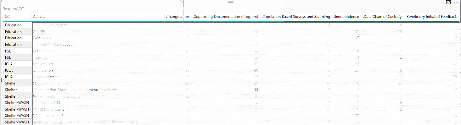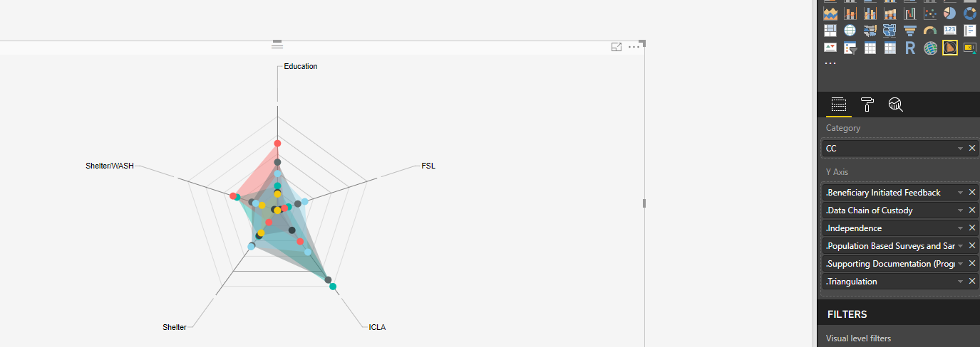 Hey Folks, i am working on a PBI dashboard and i need to use the Radar visual. as in below photo, the Y axis field i need them to be in Category field. and the category field to be in Y Axis. Category field takes only one field, so i need to deal with these six fields as one field. what i exactly need , instead of ( Shelter/WASH, Education … etc ) to have Beneficiary initiated feedback , data chain….) . i know it’s all about the data structure but anyone can help?