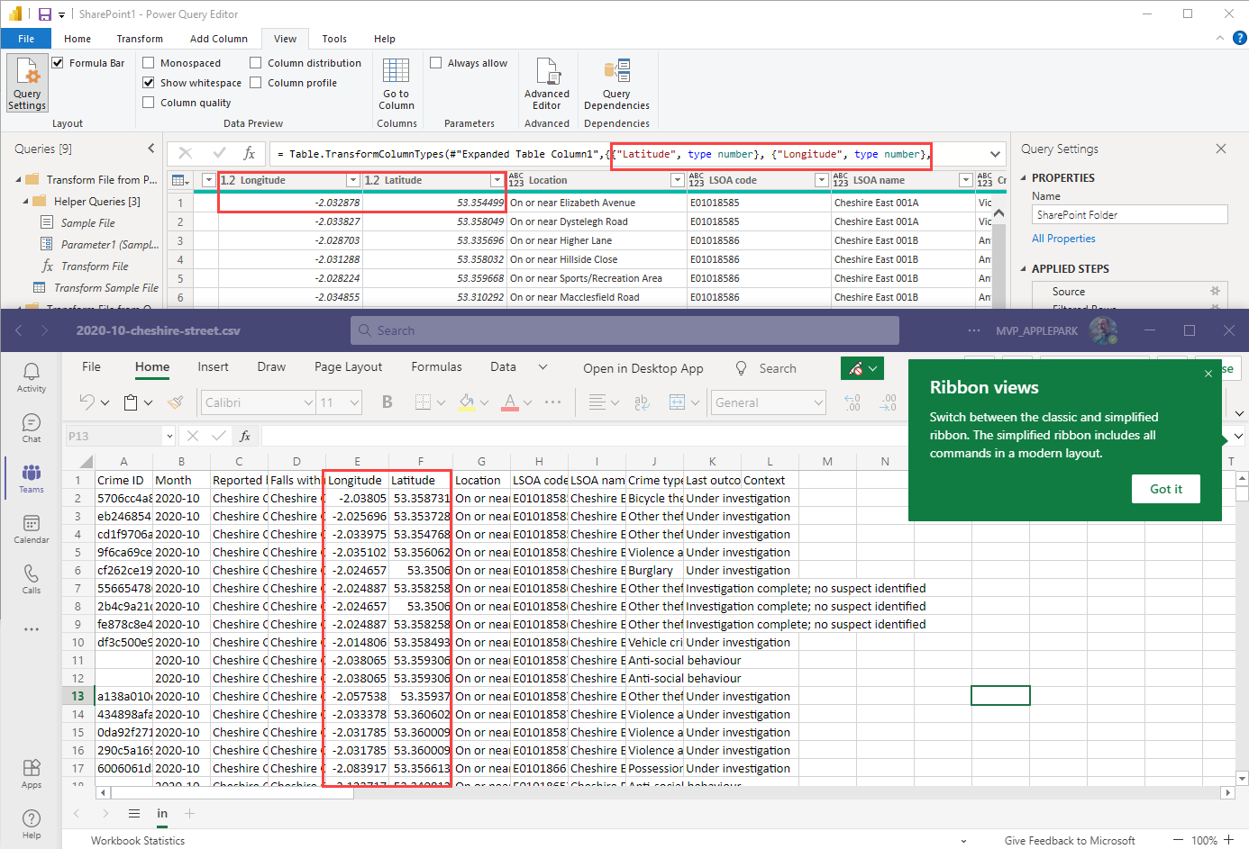 I’m building a dataflow and because of some weird header data, have to bring in all fields as text and change the type in later steps. I have Lat/Long fields with 15 digit precision, but after changing the data type to decimal number, it strips the precision and is only storing 3 digits. I don’t don’t see any spot to update and keep all the digits. Normally I wouldn’t be upset about lower precision, but with Lat/Long I’d prefer at least 5.Ā Any ideas of additional M code I can add to specify precision before/after/during the data type change from text to decimal? Screen shots attached.