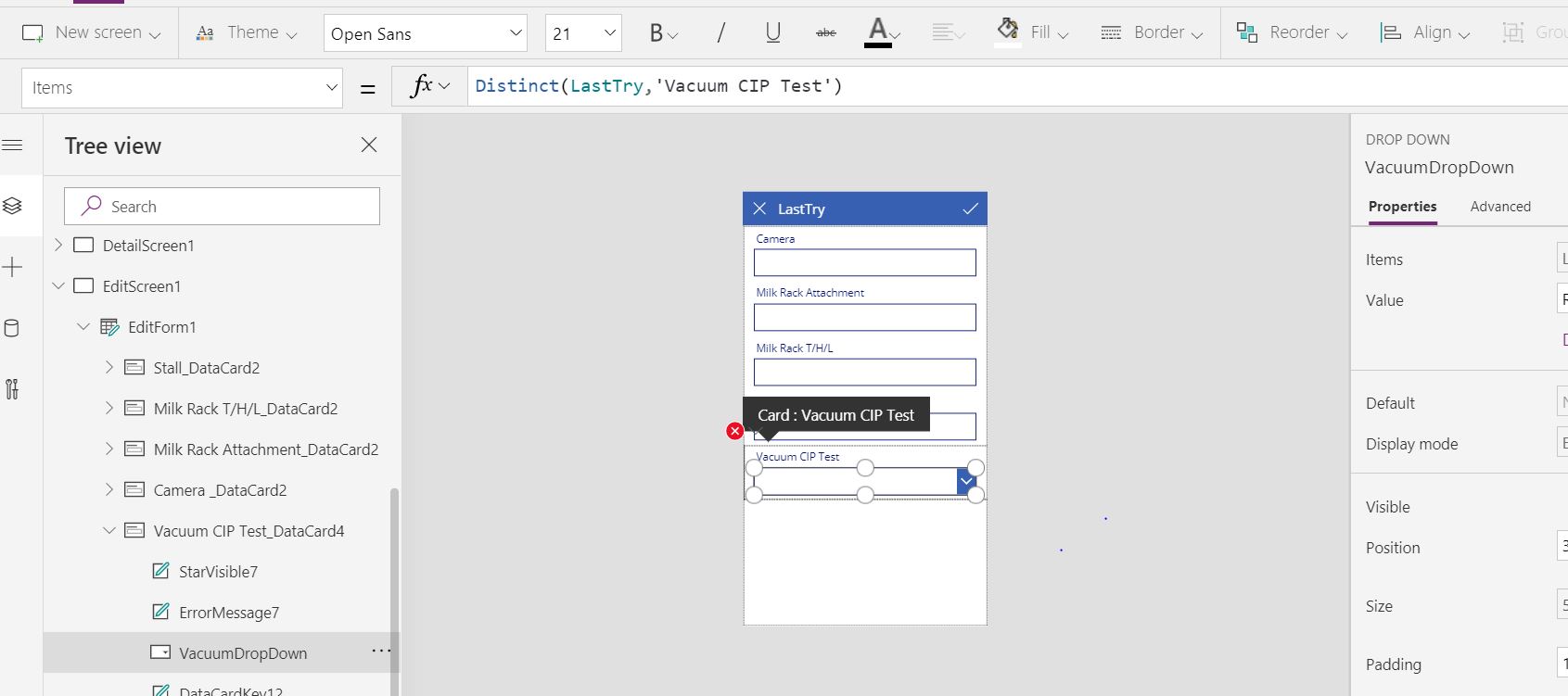 A Distinct formula – the update properties of the card will be VacuumDropdown.Result——————————