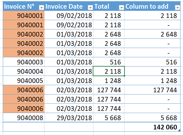 I have a table in which there are lines (invoices) that repeat themselves. I want to create a column in which I copy the amount of each invoice for the first time and put a zeros for the duplicates. below is an example.