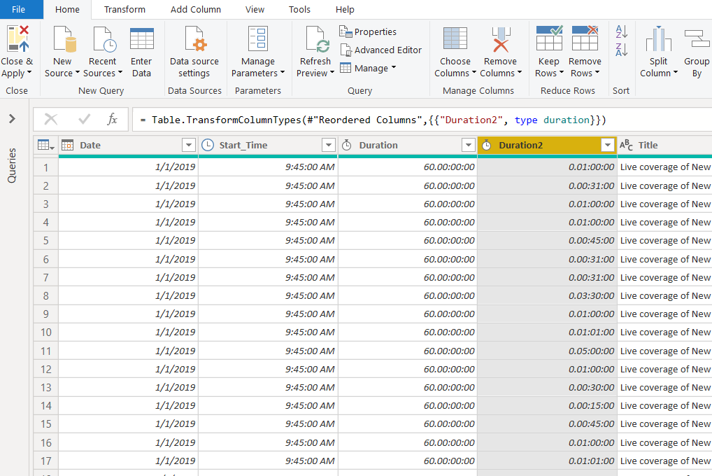 Hi Vince,Thank you, Can you please explain how I can make the conversion for the duration column? Power Bi is so new to me. I thought if I just changed the data type to duration that would be okay? Can I correct something in here? If I try to change it to any other data type I get an error.Ā