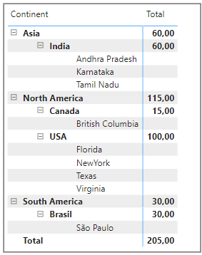 My expecteds outputs: I want to show the output in Matrix table 3 levels (Continent, Country and State) sales. But I only want to see total in Continent and Country Level but if expand to State it should be blank as mentioned below. -At Country Level: