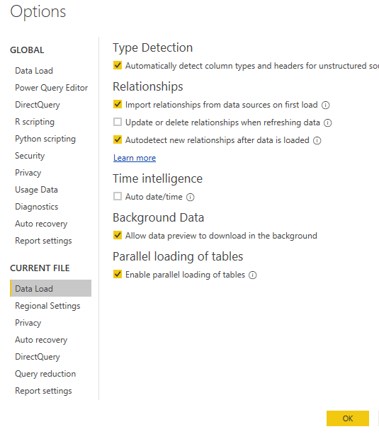 Another route, and something I always recommend is to turn off Power BI’s auto date/time, under Time Intelligence (in the options menu).Ā Turning this off will stop PowerBI from creating these invisible date tables/hierarchies.Ā If you go this route, you can also mark your Calendar table as a date table.