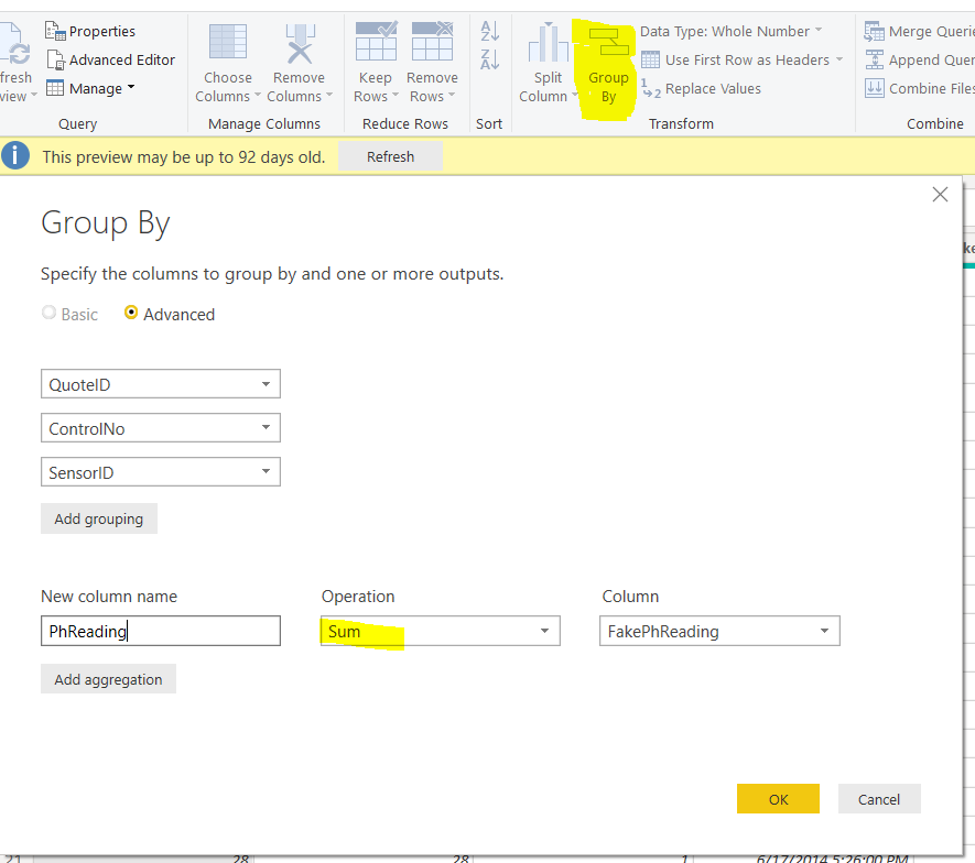 This is what the Group By configuration window looks like with some example data I have.