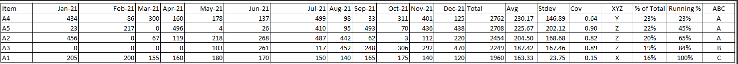 Hi I am trying to create a dynamic segmentation ABC/XYZ following the tutorial : https://www.daxpatterns.com/abc-classification/I can without problem create a ABC segmentation and a XYZ segmentation, but I need to have the both at the same time. for context : ABC is a basic pareto: A = 80% of Value sold, B = 15% of Value and C=5% of Value Sold XYZ is the measure of the variability using the Coefficient of variation (CoV) with CoV = Divide(Standard Deviation, Average Sales) (Deviation and Average measured on a monthly basis) I can do the dymamic segmentation separately using the DAX patter, no problem, but I want to be able to present the data in a matrix ABC/XYZ, so I would need to combine the both calculation together, and I am strggling with that. I have attached a file to explain the Logic, but in summary below explain what I am trying to achieve: