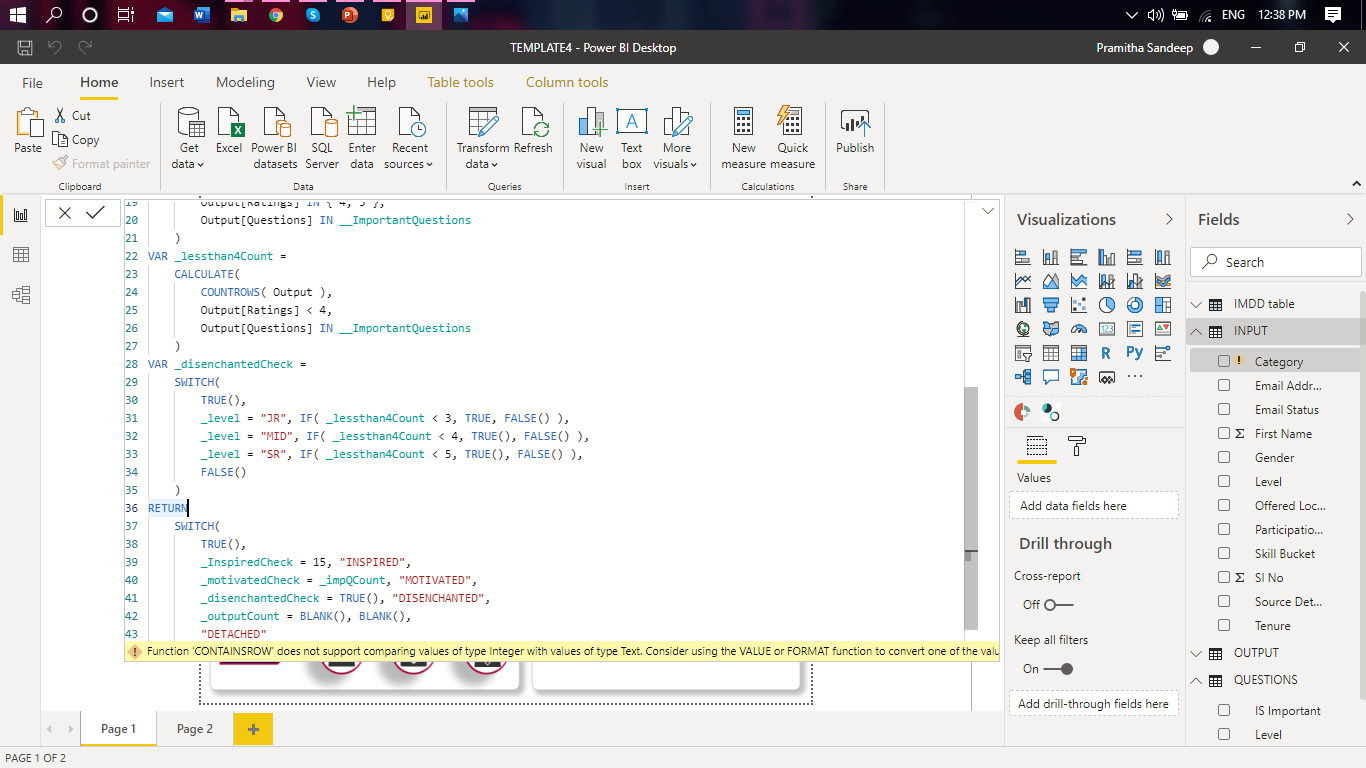 3. DAX for the calculated column.Category = --------------------------------------------------- VAR _emailID = Input[Email Address] --current row context VAR _level = Input[Level] -- current row context VAR __ImportantQuestions = CALCULATETABLE( VALUES( Questions[Qno] ), Questions[Level] = _level, Questions[IS Important] = TRUE() ) --temp table to hold the important questions relevant to the current level VAR _impQCount = COUNTROWS( __ImportantQuestions ) --the count of important questions for the current level in context VAR _outputCount = CALCULATE( COUNTROWS( Output ), Output[Email Address] = _emailID ) --total number of rows in the output table for the email in row context. This is to check if the person has answered the questions. ------------------------------------------------ --INSPIRED Check --INSPIRED: All questions need to be rated 4 or 5 by an employee VAR _InspiredCheck = CALCULATE( COUNTROWS( Output ), Output[Ratings] IN { 4, 5 } ) ------------------------------------------------ --MOTIVATED check --MOTIVATED: Only "Very Important" Questions need to be rated 4 or 5 VAR _motivatedCheck = CALCULATE( COUNTROWS( Output ), Output[Ratings] IN { 4, 5 }, Output[Questions] IN __ImportantQuestions ) ------------------------------------------------ --DISENCHANTED check /*DISENCHANTED: Junior: Out of the 5 Very Important questions, any 1 question should be rated less than 4. Middle: Out of the 6 Very Important questions, any 3 questions should be rated less than 4. Senior: Out of the 9 Very Important questions, any 4 questions should be rated less than 4 */ VAR _lessthan4Count = CALCULATE( COUNTROWS( Output ), Output[Ratings] < 4, Output[Questions] IN __ImportantQuestions ) VAR _disenchantedCheck = SWITCH( TRUE(), _level = "JR", IF( _lessthan4Count = 1, TRUE, FALSE() ), _level = "MID", IF( _lessthan4Count = 3, TRUE(), FALSE() ), _level = "SR", IF( _lessthan4Count = 4, TRUE(), FALSE() ), FALSE() ) ------------------------------------------------- RETURN /* Logic: Inspired = the count of rating 4,5 should be equal to the number of questions which is 15 Motivated = all important questions should have rating 4 or 5 Disenchanted: the output from the variable disenchanted check should be true Blank: if there are employees in Input who has not yet answered the questions, then their classification is taken as blank detached: employees not falling in any of the above 4 categories */ SWITCH( TRUE(), _InspiredCheck = 15, "INSPIRED", _motivatedCheck = _impQCount, "MOTIVATED", _disenchantedCheck = TRUE(), "DISENCHANTED", _outputCount = BLANK(), BLANK(), "DETACHED" ) ?I am not sure as to how this will work with your other reporting requirements. Hope at least that it gives an idea of the solution. Has also attached the pbix and the excel data files I used for your reference. ——————————
