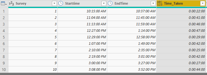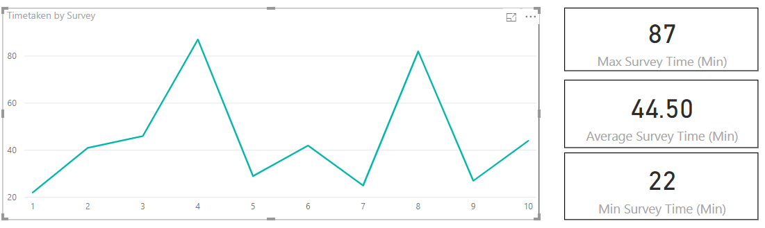 I have a survey data with time taken to complete the survey. I am trying to plot this information to show what is the average, max and min time taken to complete the survey. I want to create measure in power bi but I couldn’t find sample DAX formula for this.