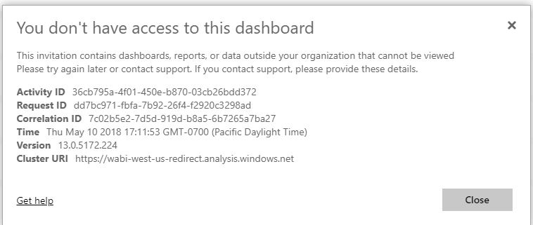 When I try to share one of my dashboards with my coworker or when she tries to share a dashboard with me, I receive the following message from Power BI online