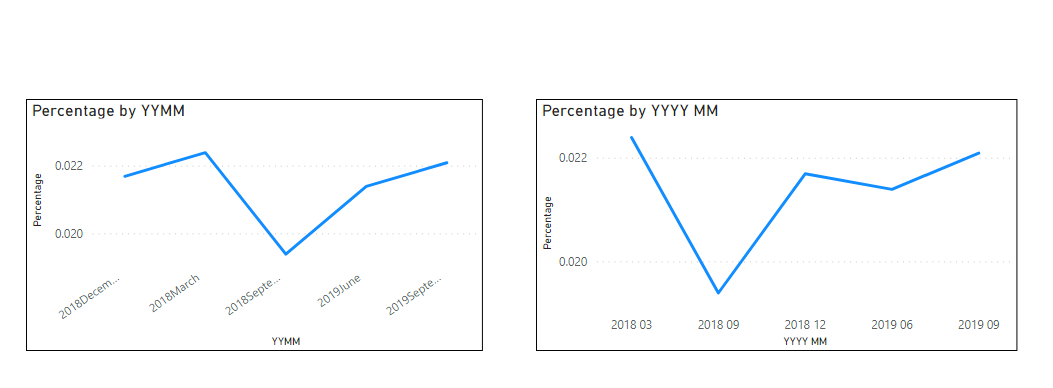 All experts, need helps. I m able to show 5 plots in Table (2018 Sep, 2018 Dec, 2019 Mar, 2019 Jun, 2019 Sep) , but when show in Line Chart, it only show the 2 plots (2018 & 2019 only).