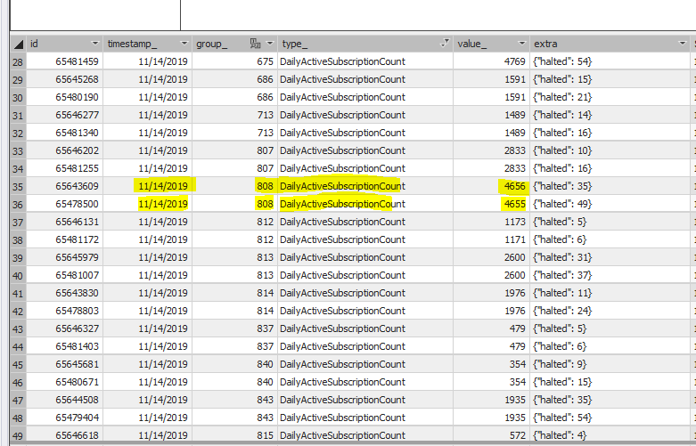 Table = Statistic Columns = type_, timestamp_, value_, group_ Notes = some group_ have multiple entries for the same timestamp_ with different value_ amountsĀ Ā