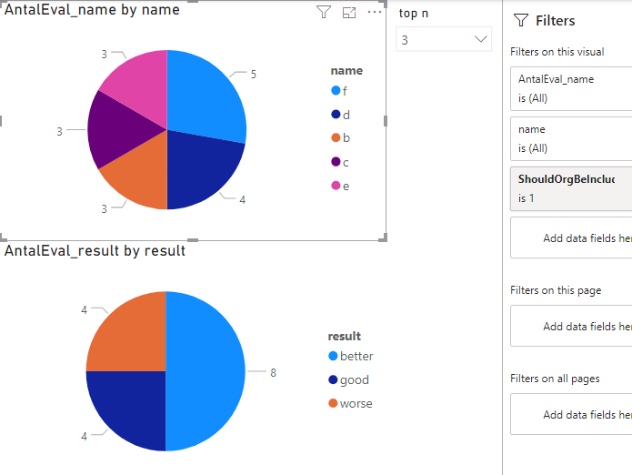 Hi, I have a report where I would like to present data from my Top N customers (N is selected in the report). To present which customer that are my Top N is no problem (see visual with header AntalEval_name by name). But the problem is to the present data connected to my Top N customers (see visual with header AntalEval_result by result).