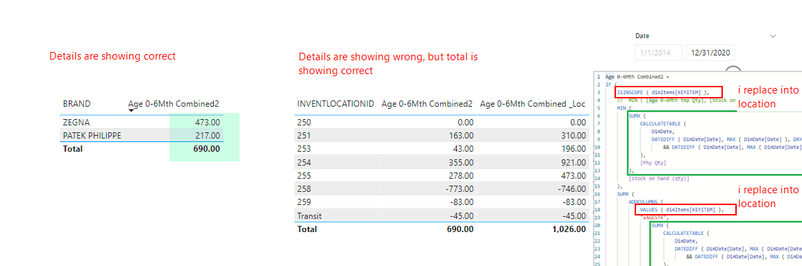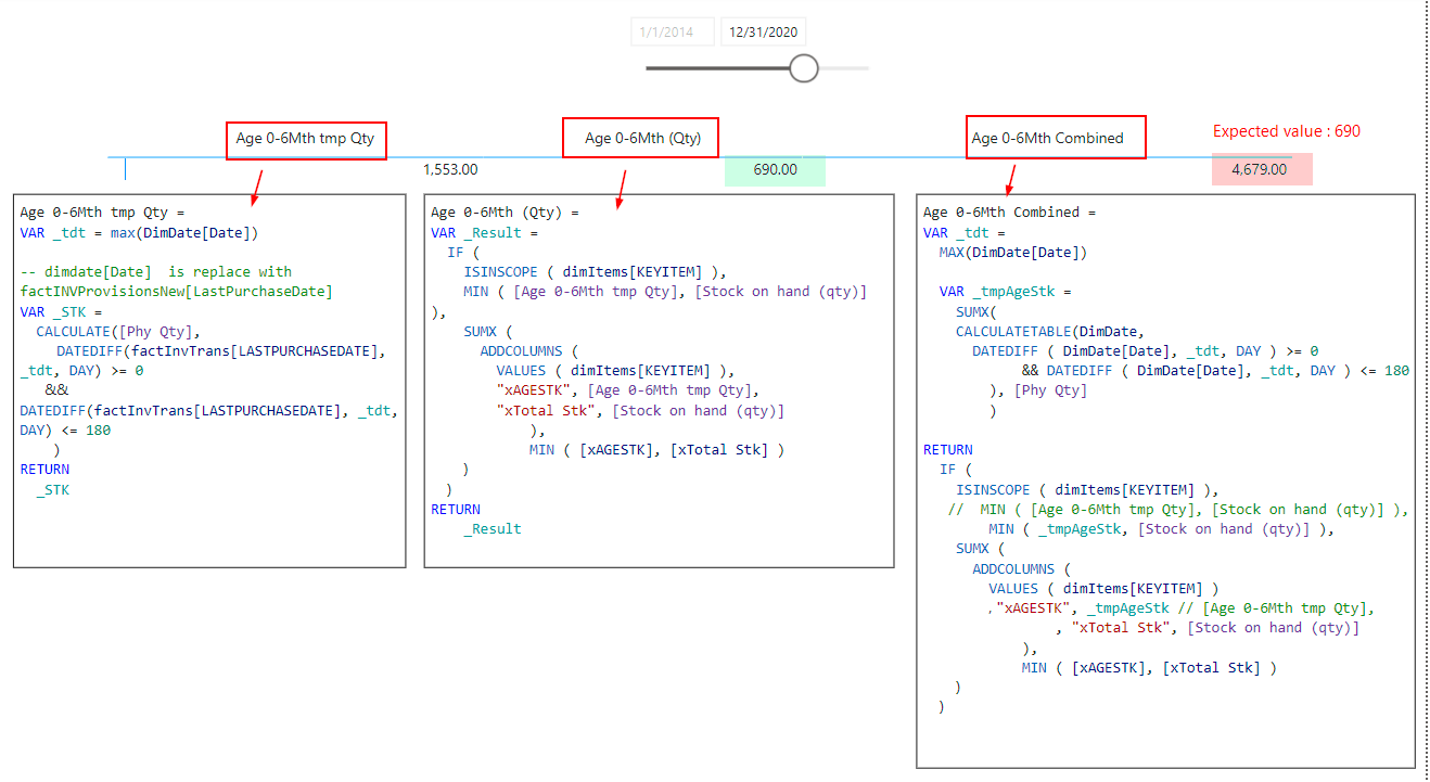 i’m having a problem to calculate the AGING balance; However i have 2 measures to calculate my aging stock and works fine with expected result (690). Whereas i wanted to merge this into one measure and i’m not getting the correct values 690 instead of 4679 Please help me, how can i get correct value (690) instead of 4679Ā Sample file attached for your reference