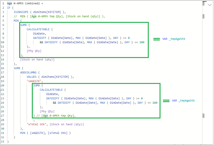Acho que nĆ£o deu certo por que a variĆ”vel nĆ£o altera por ser estĆ”tica. Troquei a variĆ”vel _tdt por MAX(DimDate[Date]), e a variĆ”vel _tmpAgeStk pela formula toda.Ā