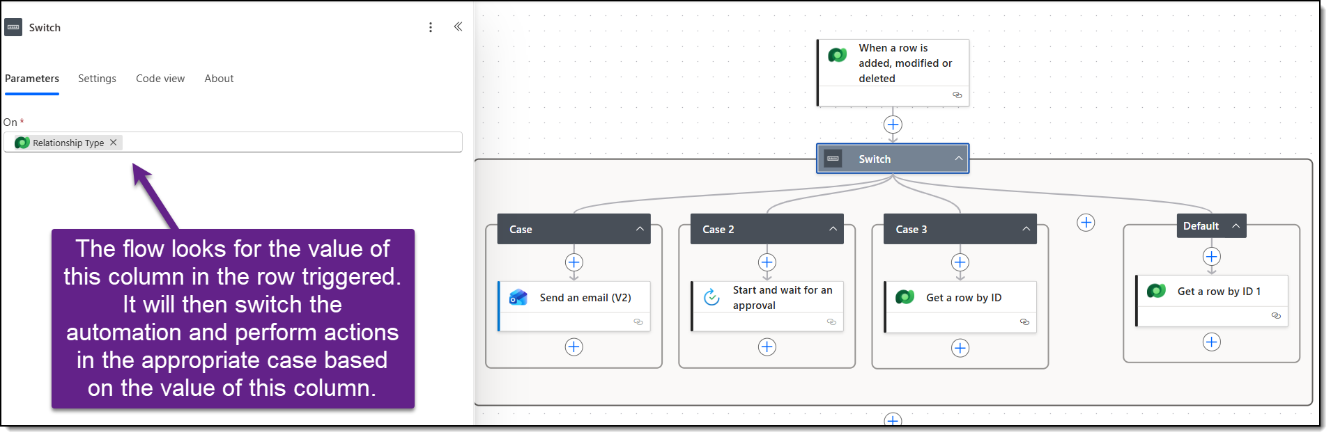 The switch action is best used when you have one variable that may equal 3+ scenarios. In my flows, I use this when I need different actions to happen based on the values of an option set. For example, if an Account is a Customer, do (x), if an Account is a Prospect, do (y), and if an Account is a Vendor, do (z). Additionally, there is a Default case that will occur if none of the cases match.