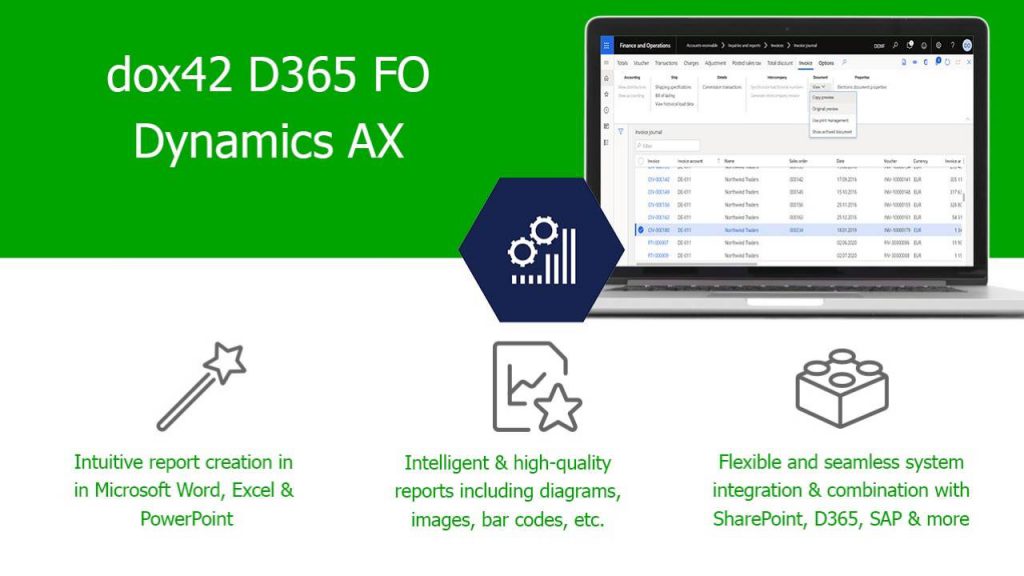 Design report templates in Microsoft Word, Excel and PowerPoint and generate customer-centric documents like invoices, delivery notes and more directly in FO.
